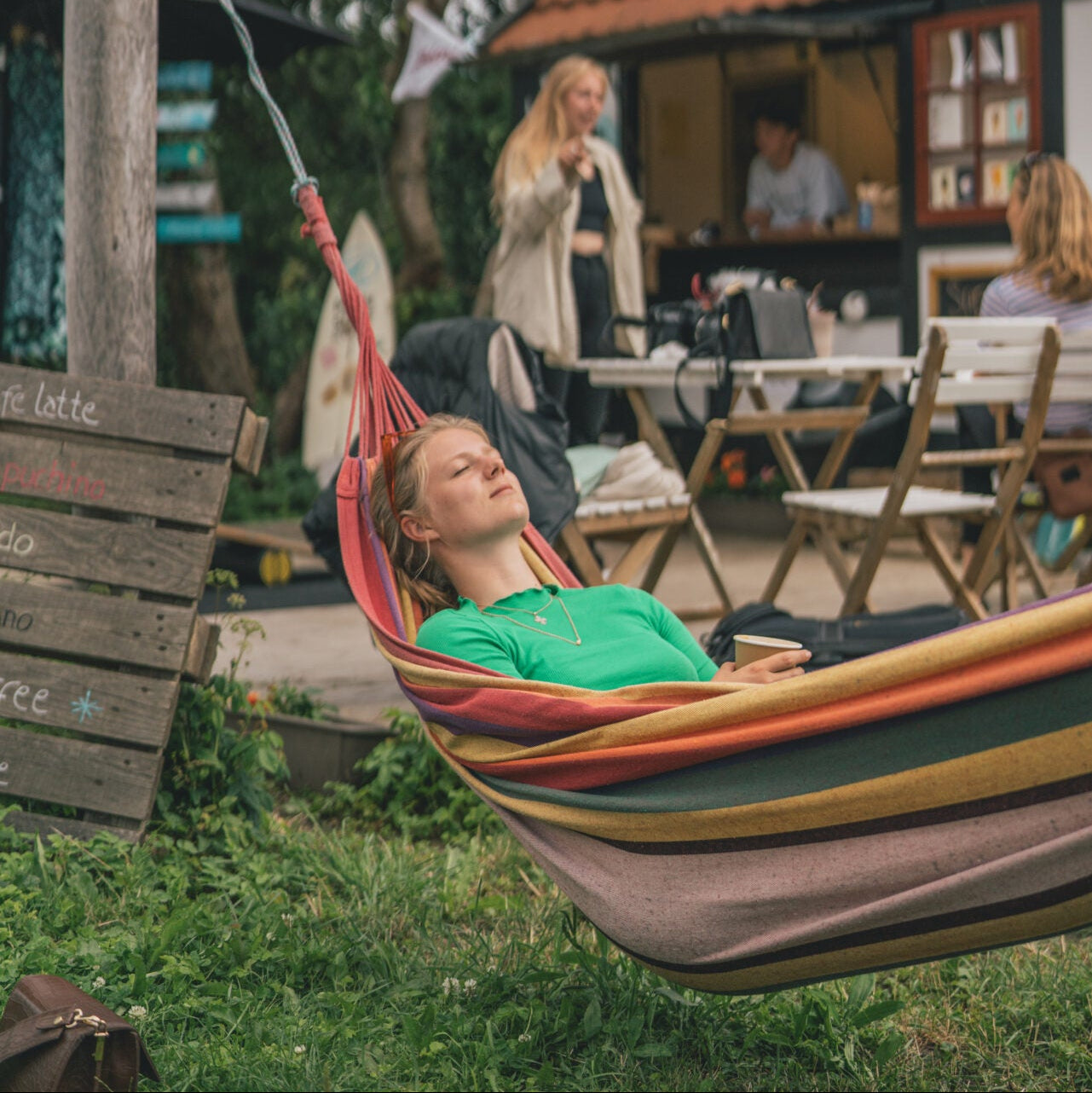 I vores Surfcafé og shop på Klintholm Havn kan du leje SUP og Surfboards! Du kan også slappe af i en hængekøje eller nyde en lækker kop kaffe på stranden.